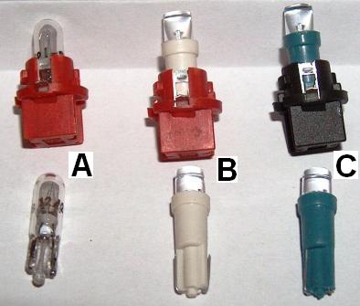 B na dole = diodowy zamiennik żarówki (całoszklanej na wcisk ) R5 12V o barwie świecenia niebieskiej.
